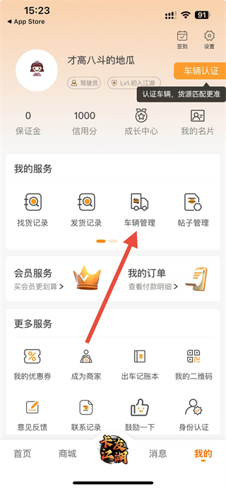 1、打開卡兄卡弟app,在我的頁(yè)面點(diǎn)擊車輛管理選項(xiàng),進(jìn)入車輛管理頁(yè)面。