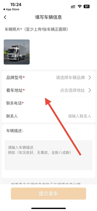 3、在填寫車輛信息頁(yè)面,上傳車輛照片,選擇品牌型號(hào)等信息,點(diǎn)擊提交賣車按鈕完成二手車發(fā)布。