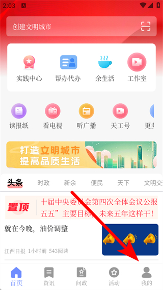 1、打開天工新余APP首頁,點(diǎn)擊底部我的,進(jìn)入個人的頁面。