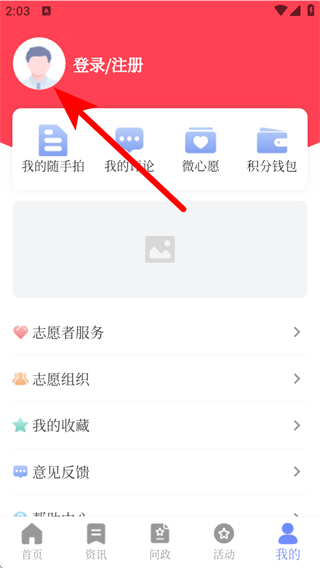 2、在個人的頁面,需要點(diǎn)擊登錄/注冊,進(jìn)入登錄的界面。