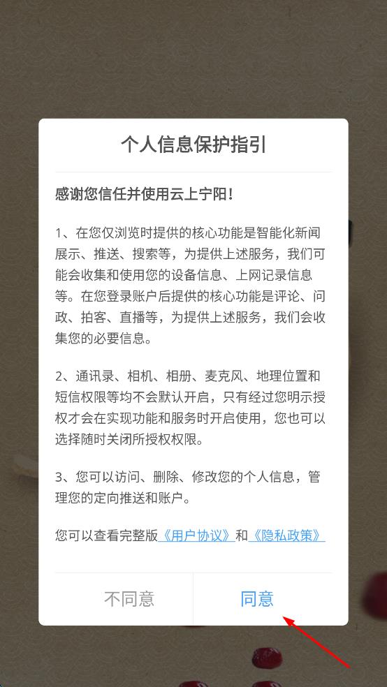 1、打開云上寧陽APP,在彈出的個(gè)人信息保護(hù)指引提示框中,點(diǎn)擊同意。