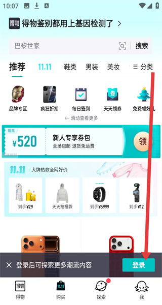 1、在得物APP首頁(yè)點(diǎn)擊右下角“我”,進(jìn)入登錄頁(yè)面。