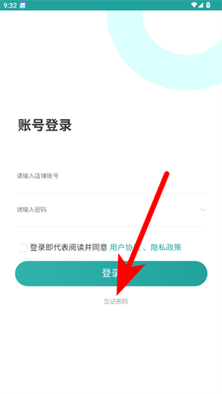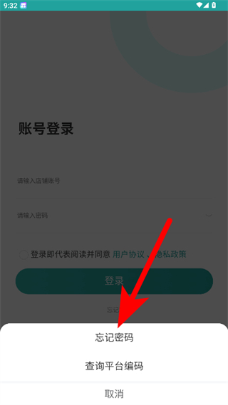 1、在快跑者app賬號登錄頁面,點(diǎn)擊忘記密碼選項(xiàng),彈出功能菜單。