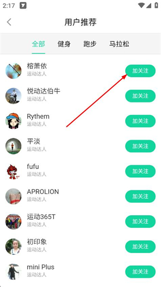 4、選擇想要關(guān)注的運(yùn)動(dòng)達(dá)人,點(diǎn)擊其右側(cè)的加關(guān)注,即可添加為好友。