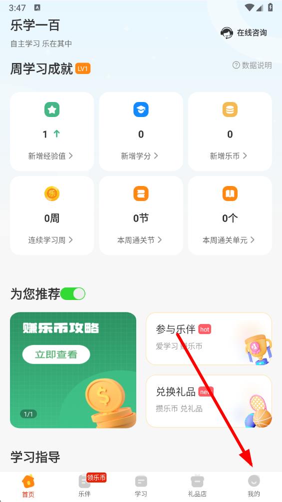 1、打開樂學(xué)一百app,在首頁點擊右下角的我的選項,進入個人頁面。