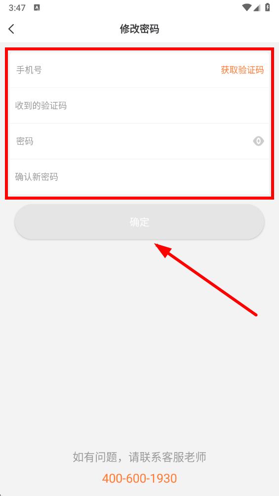4、在修改密碼頁面,依次填寫手機號、驗證碼、新密碼,填寫完畢后點擊確定按鈕,即可完成密碼修改。