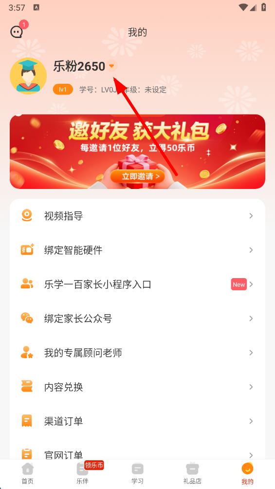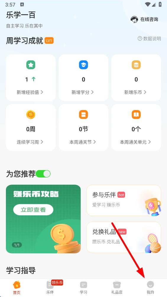 1、打開樂學(xué)一百app,在首頁點(diǎn)擊右下角的我的選項(xiàng),進(jìn)入個(gè)人頁面。