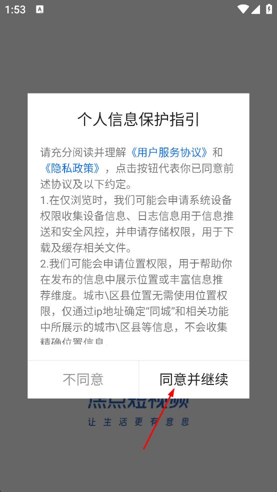 1、打開點點短視頻,會彈出個人信息保護指引,仔細閱讀相關(guān)內(nèi)容后,點擊“同意并繼續(xù)”按鈕,進入軟件主界面。