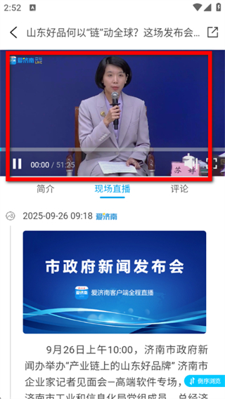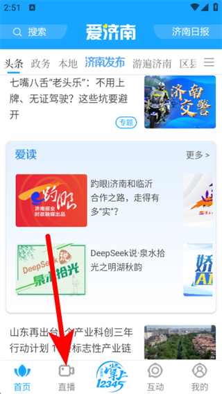 1、在愛(ài)濟(jì)南APP首頁(yè),點(diǎn)擊直播選項(xiàng),進(jìn)入直播頻道。