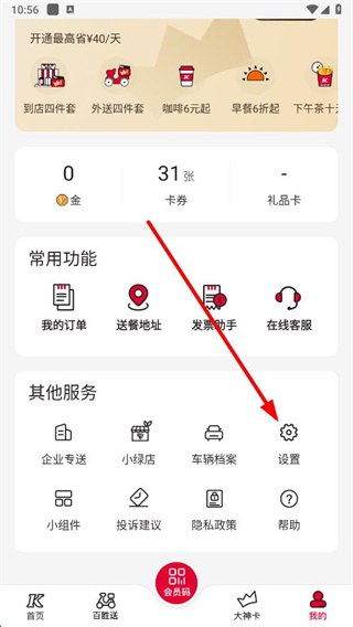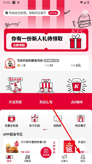 1、打開肯德基app,點擊底部導航欄我的,在大神卡板塊下方找到“早餐6折起”圖標,點擊進入早餐頁面。