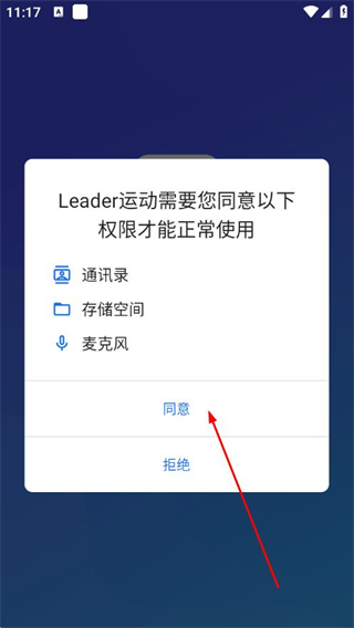 1、打開Leader運(yùn)動(dòng)APP,在權(quán)限請(qǐng)求彈窗中點(diǎn)擊同意。