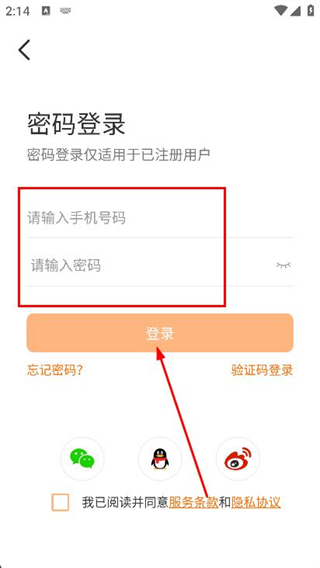 4、輸入手機(jī)號(hào)碼和密碼,點(diǎn)擊登錄即可登錄賬號(hào)。