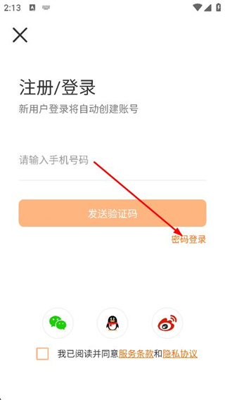 3、在注冊(cè)/登錄頁(yè)面,點(diǎn)擊下方密碼登錄選項(xiàng)。