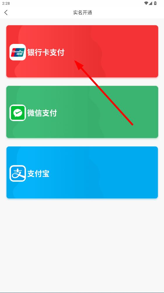 3、在實(shí)名開通頁面,選擇銀行卡支付選項(xiàng),進(jìn)入實(shí)名認(rèn)證信息填寫頁面。