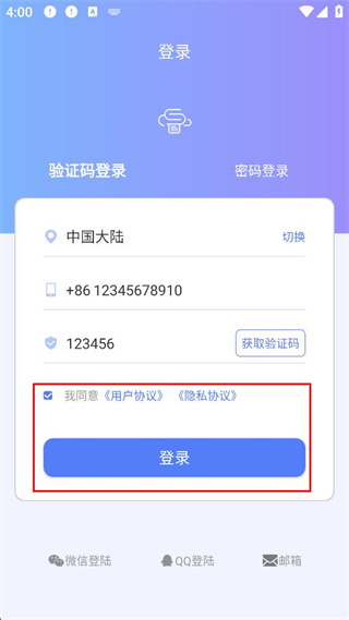 4、勾選同意用戶協(xié)議和隱私協(xié)議后點(diǎn)擊“登錄”。