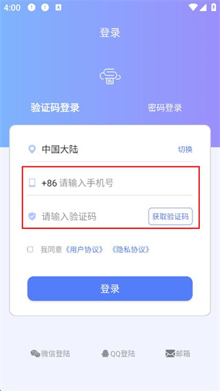 3、在驗(yàn)證碼登錄界面輸入手機(jī)號(hào),點(diǎn)擊“獲取驗(yàn)證碼”并輸入驗(yàn)證碼。