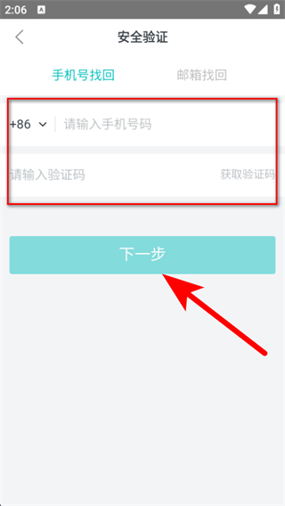 2、選擇找回方式,若選手機(jī)號(hào)找回,輸入手機(jī)號(hào)碼和驗(yàn)證碼,點(diǎn)擊下一步。