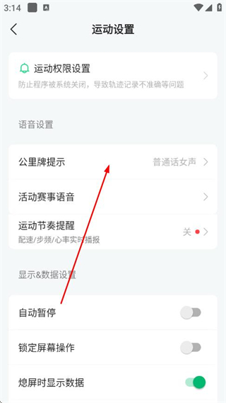 3、在運動設(shè)置頁面,點擊公里牌提示,進入公里牌提示設(shè)置頁面。
