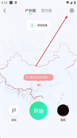 2、在戶外跑頁面點擊,右上角的設(shè)置圖標(biāo),進入運動設(shè)置頁面。