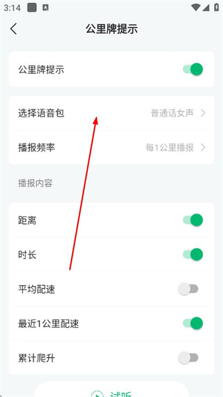 4、在公里牌提示設(shè)置頁面,點擊選擇語音包,進入語音包選擇頁面。