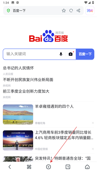 1、打開UC瀏覽器,點擊底部中間的菜單按鈕。