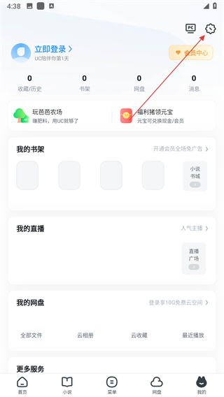 1、打開UC瀏覽器,點擊我的頁面的設(shè)置圖標(biāo)。