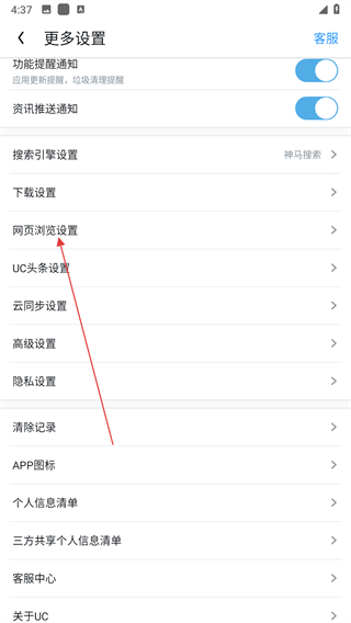 2、在設(shè)置頁面,點擊網(wǎng)頁瀏覽設(shè)置選項。