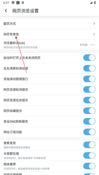 3、在網(wǎng)頁瀏覽設(shè)置頁面,點擊網(wǎng)頁背景色選項。
