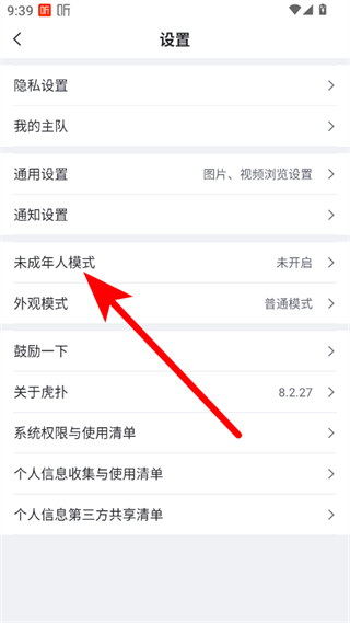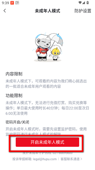 4、在未成年人模式界面,點擊開啟未成年人模式按鈕,即可開啟虎撲未成年模式。