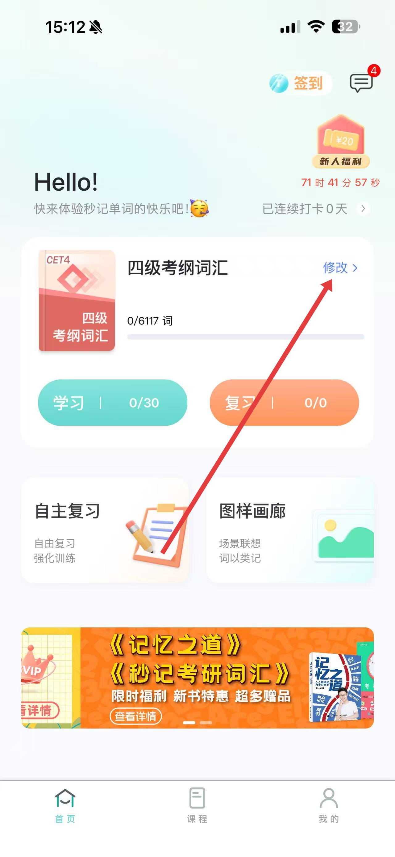 1、打開(kāi)圖樣單詞APP,在首頁(yè)點(diǎn)擊四級(jí)考綱詞匯右側(cè)的修改按鈕。