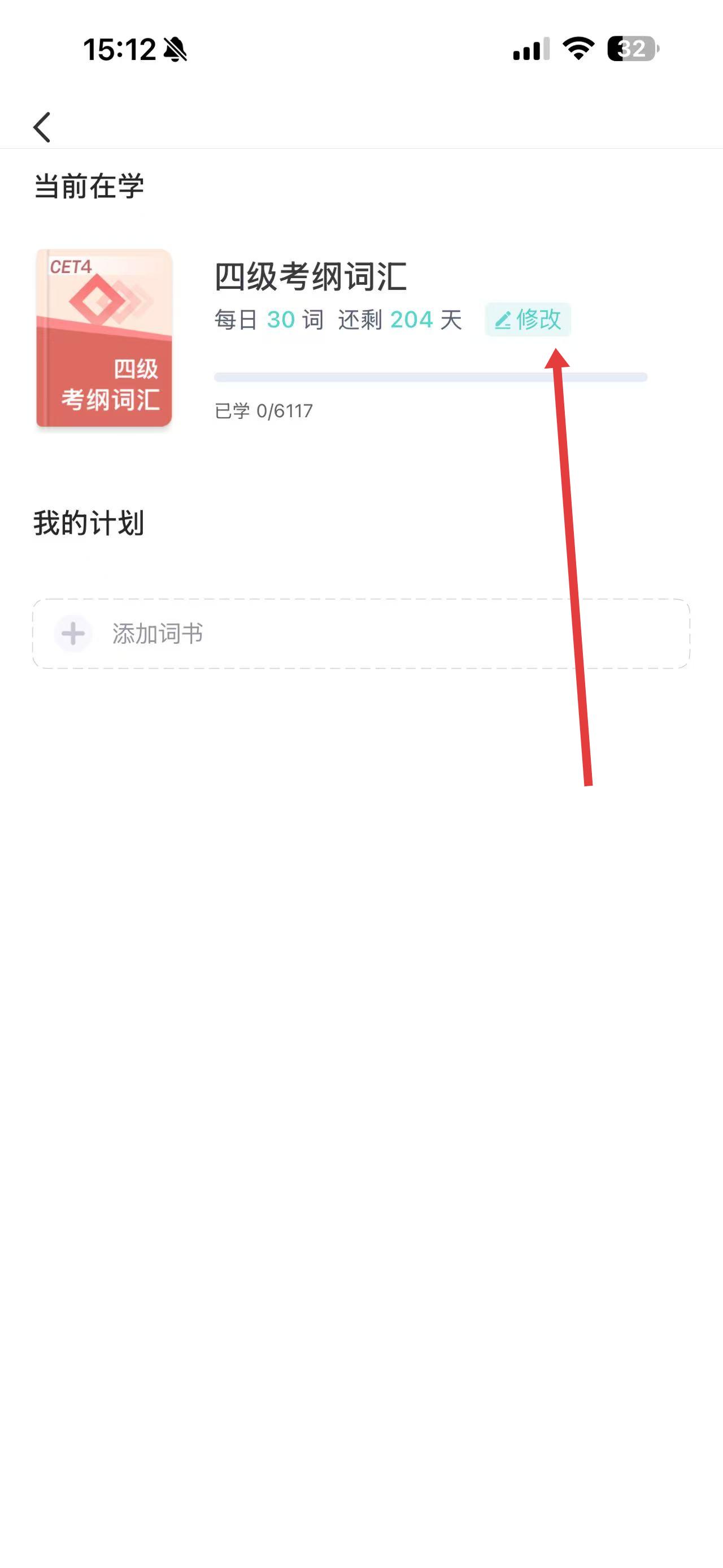 2、進(jìn)入學(xué)習(xí)計(jì)劃頁(yè)面后,點(diǎn)擊每日學(xué)習(xí)量旁邊的修改選項(xiàng)。