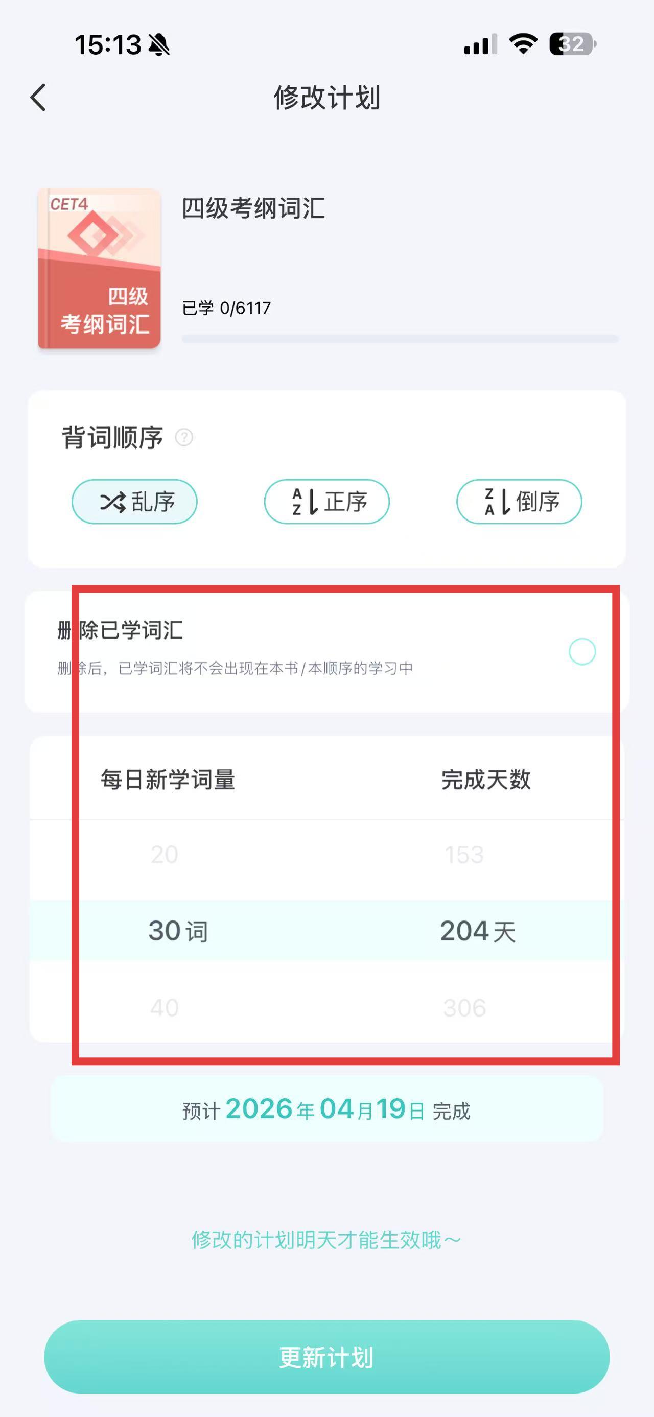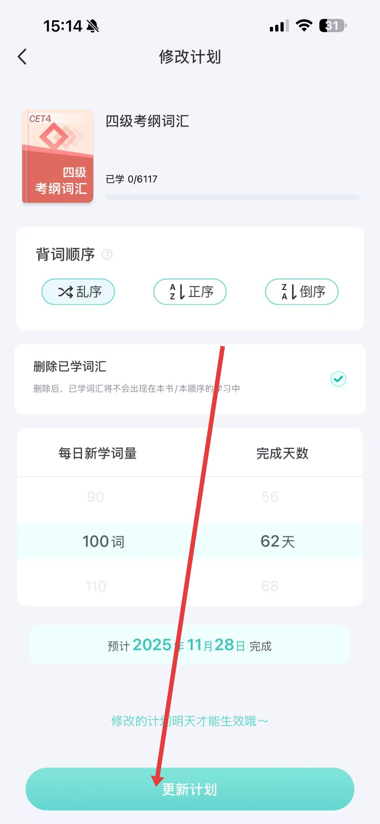 4、選擇好每日新學(xué)詞量后,點(diǎn)擊頁(yè)面下方的更新計(jì)劃按鈕,完成設(shè)置。