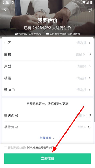 3、在頁(yè)面填寫(xiě)房源信息,若有贈(zèng)送面積和裝修費(fèi)用也可填寫(xiě),點(diǎn)擊立即估價(jià)。