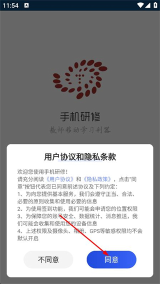 1、打開手機(jī)研修APP,在隱私條款彈窗中點(diǎn)擊同意。