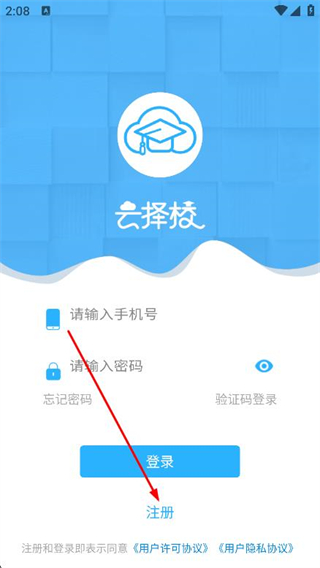 1、打開云擇校,在登錄頁面點擊下方的注冊選項。