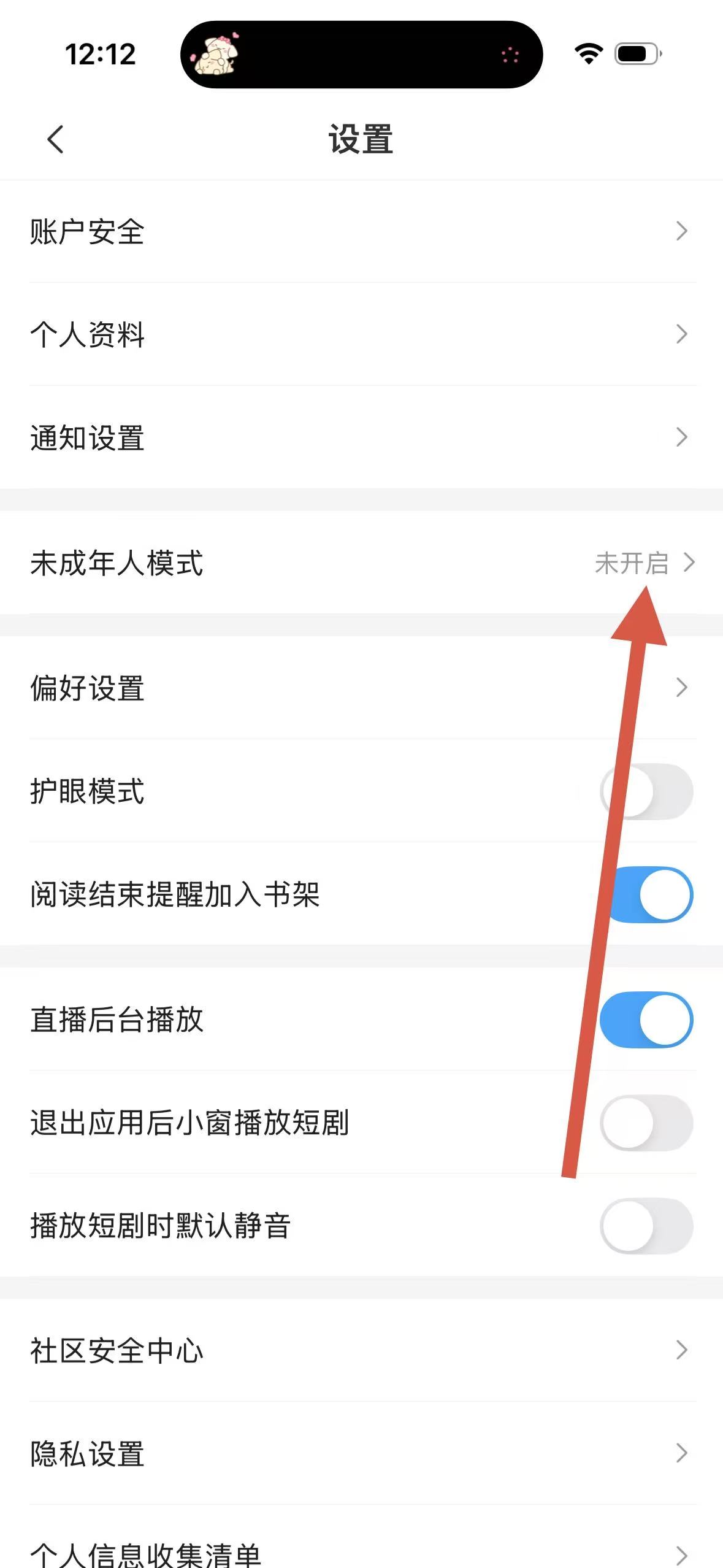 3、在設(shè)置頁(yè)面里,找到未成年人模式選項(xiàng)并點(diǎn)擊進(jìn)入。