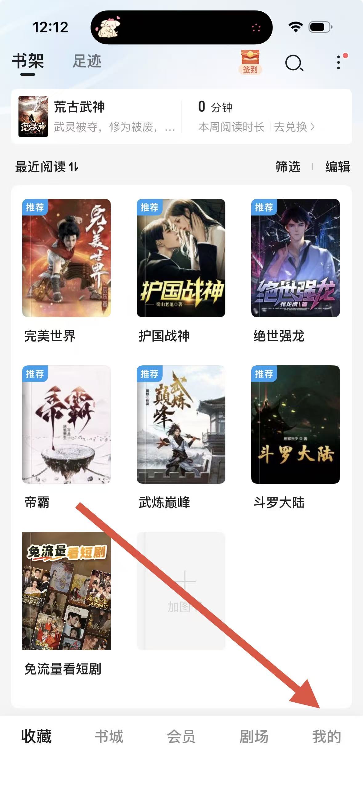 1、打開(kāi)咪咕閱讀APP,在書(shū)架界面點(diǎn)擊底部導(dǎo)航欄中的我的選項(xiàng)。