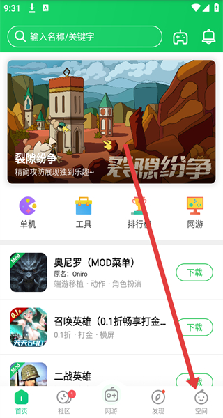 1、在進入到葫蘆俠修改器首頁中,可以點擊底部空間按鈕,進入個人空間頁面。