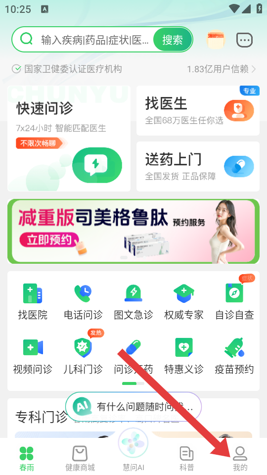 1、在春雨醫(yī)生的首頁,需要點(diǎn)擊我的,進(jìn)入個(gè)人功能的頁面。