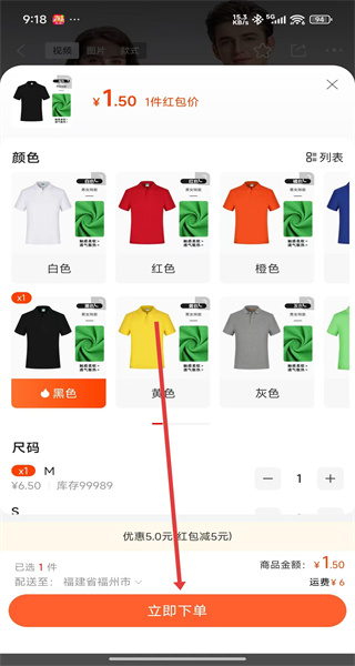 4、選擇顏色如黑色、尺碼M等規(guī)格后,點擊“立即下單”,完成下單流程。
