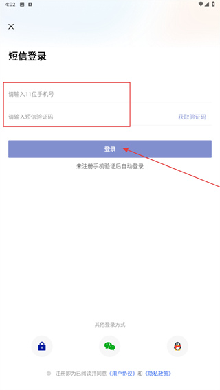 3、輸入手機號、驗證碼后,點擊登錄按鈕即可完成登錄。