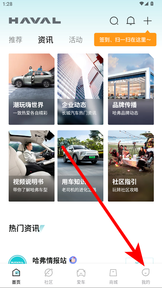 1、打開(kāi)哈弗智家APP,在首頁(yè)點(diǎn)擊底部導(dǎo)航欄中的我的,進(jìn)入個(gè)人界面。