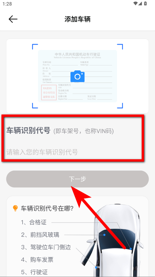 3、點(diǎn)擊添加車輛,輸入車輛識(shí)別代號(hào),點(diǎn)擊下一步,完成后續(xù)車輛添加操作。