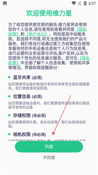 1、打開維力星APP,在歡迎頁面點(diǎn)擊同意,同意隱私政策和用戶協(xié)議。