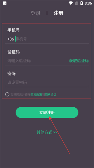 3、在注冊界面輸入手機(jī)號和驗(yàn)證碼,設(shè)置密碼后勾選同意相關(guān)協(xié)議,點(diǎn)擊立即注冊。