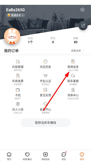 1、打開途家民宿APP,在我的頁面點(diǎn)擊常用信息選項(xiàng)。