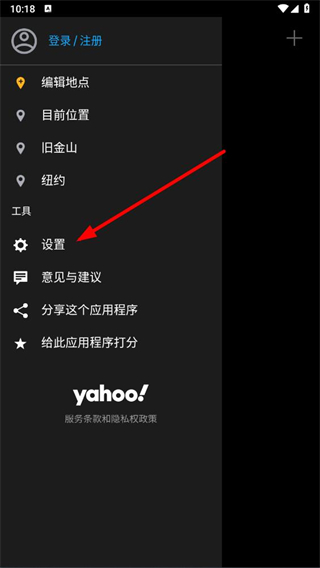 1、打開雅虎天氣APP,點(diǎn)擊左上角三條橫線的菜單按鈕,展開功能列表。