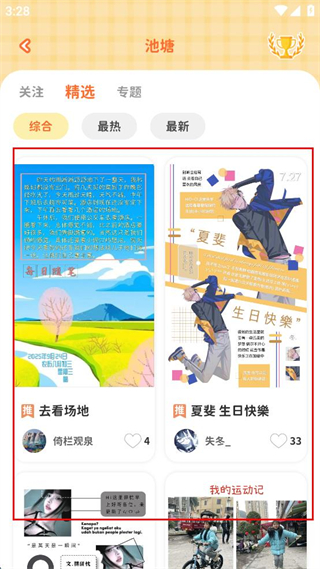4、在池塘界面即可瀏覽關(guān)注、精選、專(zhuān)題等板塊的手帳內(nèi)容。