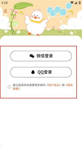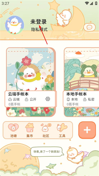 1、點(diǎn)擊愛(ài)鴨手帳首頁(yè)的未登錄區(qū)域,進(jìn)入登錄選擇界面。