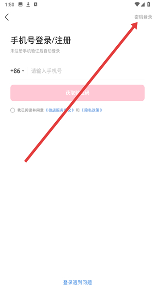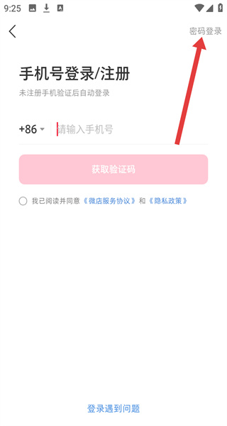 2、在進入到手機號登錄/注冊界面后,可以通過點擊右上角密碼登錄按鈕,進行切換登錄方式。